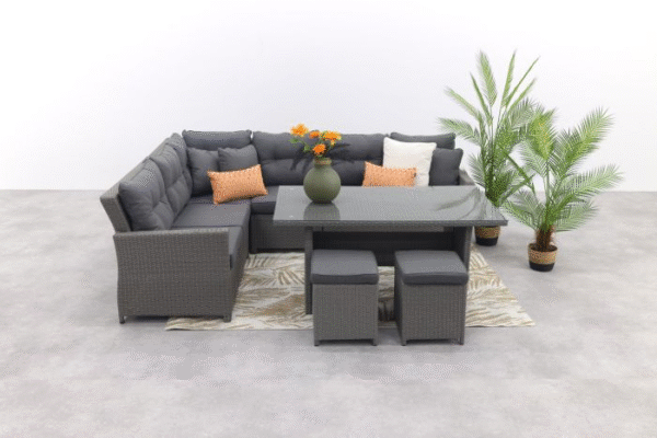 Le salon de jardin Cordoba est un ensemble d’angle polyvalent et confortable au design moderne. La finition en rotin gris, associée à de généreux coussins d’assise et de dossier, crée une atmosphère élégante et accueillante pour tout espace extérieur. Grâce à la grande table avec plateau en verre et aux deux poufs supplémentaires, cet ensemble est parfait aussi bien pour les repas que pour les moments de détente en plein air.