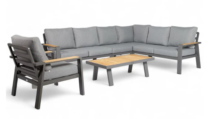 Le salon de jardin Garda allie lignes épurées et confort d’assise optimal. Grâce à ses coussins gris épais et à ses larg accoudoirs, cet ensemble est parfait pour se détendre entre amis ou en famille. Les coussins déperlants et la finition en aluminium rendent ce salon adapté à toutes les saisons.