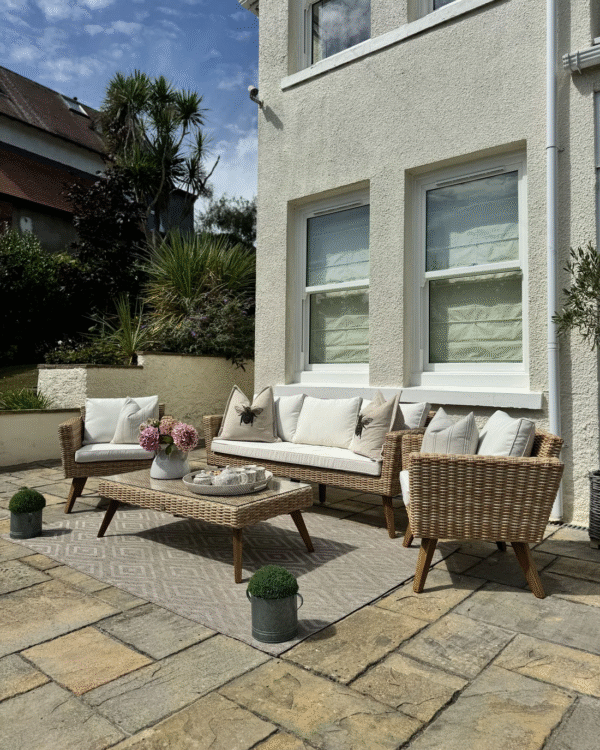 Le salon de jardin San Francisco apporte une atmosphère naturelle et légère à tout jardin ou terrasse. L’ensemble associe un élégant aspect rotin naturel à des pieds en bois robustes et des coussins d’assise moelleux. Idéal pour profiter pleinement des journées d’été, seul avec un livre ou entouré d’amis.
