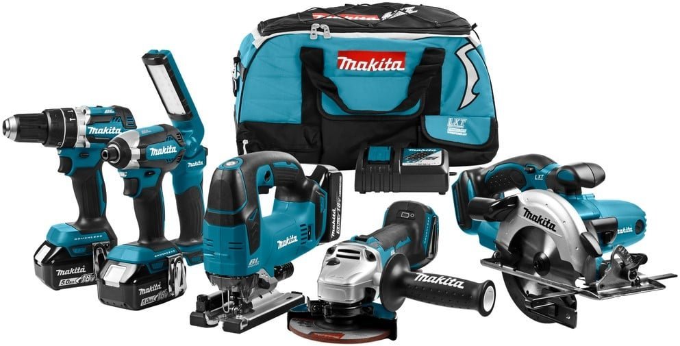 Le set Makita comprend cinq machines pratiques et une lampe, accompagnées de trois batteries et d’un chargeur, livrées dans un sac de sport.